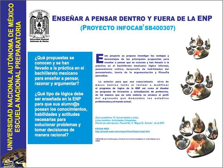 Por eso este proyecto INFOCAB 1 se propone investigar las ventajas y desventajas de las principales propuestas para enseñar a pensar que se conocen y han llevado a la práctica en el bachillerato mexicano: lógica informal, pensamiento crítico, desarrollo de habilidades de pensamiento, teoría de la argumentación y filosofía para niños.